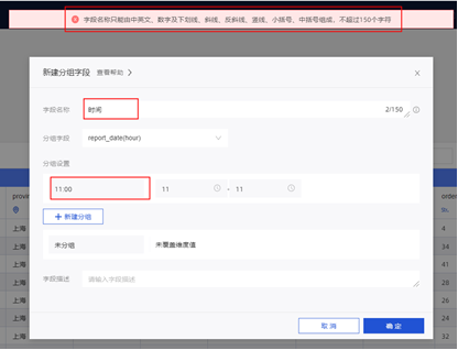 Quick BI的数据集中新建维度分组报错:“字段名称只能由中英文、数字及下划线、斜线、反斜线、竖线、小括号、中括号组成,不超过150个字符”