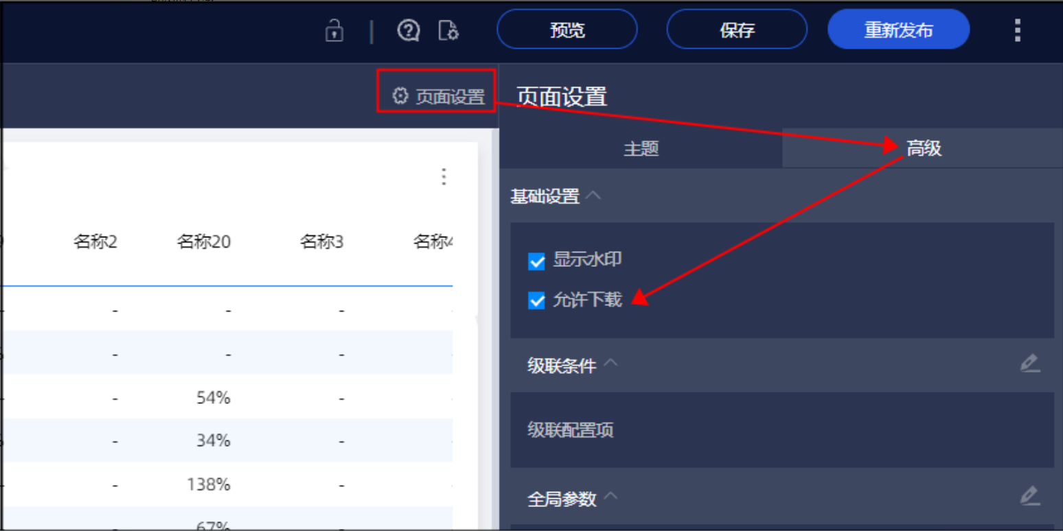 2.进入该仪表板,点击界面设置>页面设置>高级。