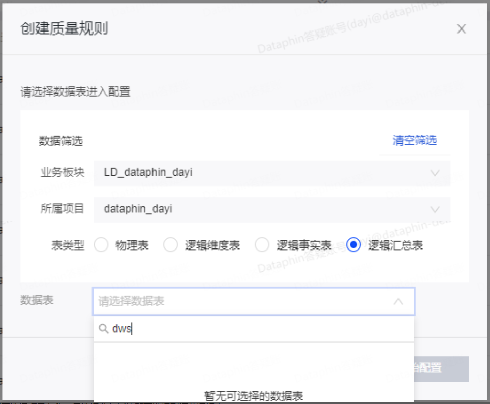 Dataphin质量规则里搜索不到汇总逻辑表,但是表是真实存在的,而且业务板块,项目,表类型这些都是选择正确,如下所示: