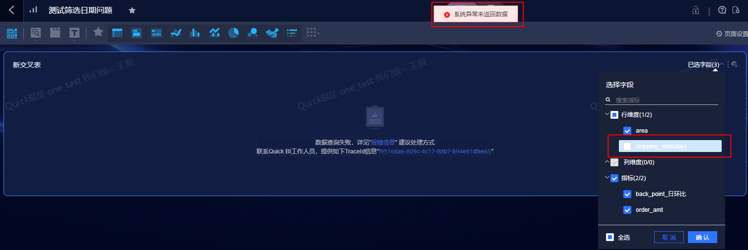 Quick BI字段内容筛选取消日期维度报错:"系统异常未返回数据"