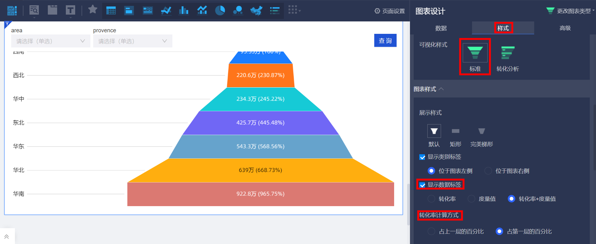 - 当选择可视化样式为“标准”时,可以勾选“显示数据标签”,勾选相应的展示内容,并选择转化率计算方式即可。