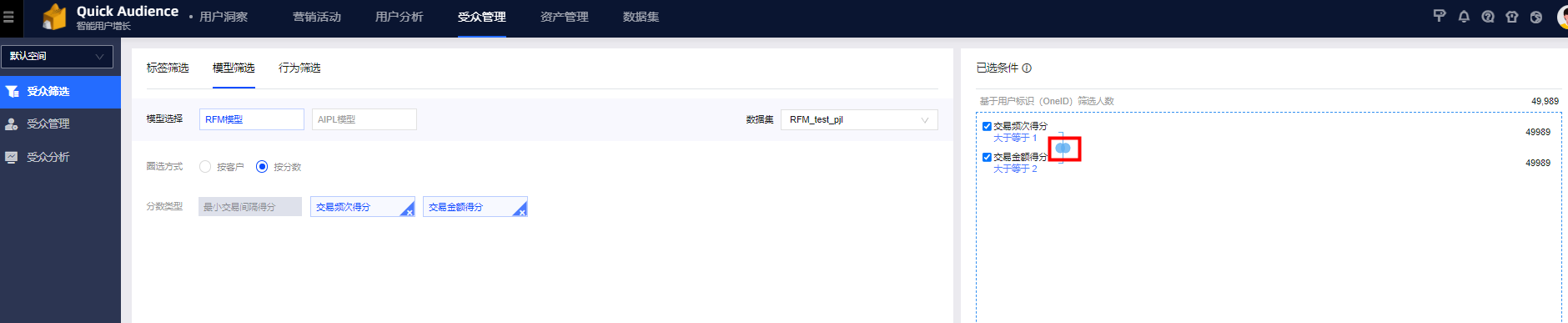 Quick Audience受众筛选的模型筛选中,RFM模型按分数筛选时,多个条件类型之间的筛选只能选择并集是什么原因?
