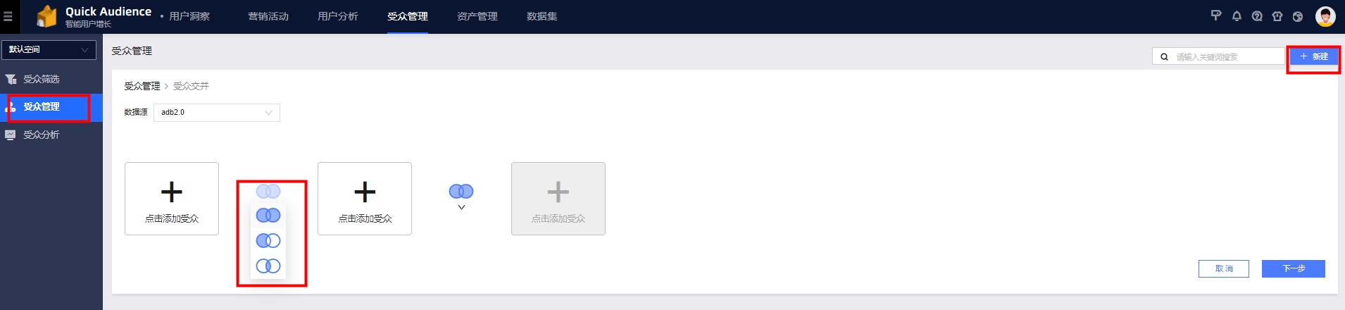 功能,对两个受众人群包再做交集/并集/差集的筛选,生成最终需要的受众人群包。