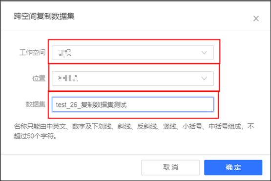 选择复制的目标工作空间及位置,并重新命名复制数据集的名称。