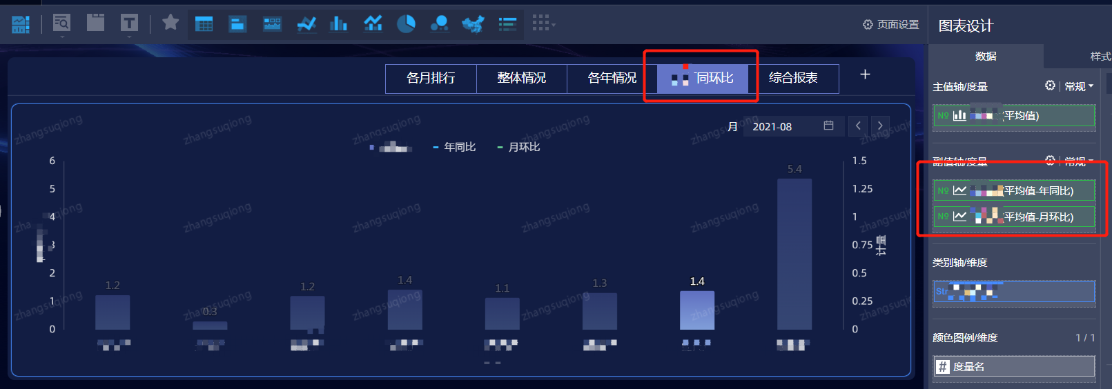 当查询控件所选择时间区间跨过一个月的时候才会显示月环比,时间区间跨过一年的时候才会显示年同比,用户需要添加年维度字段和月维度字段,查询控件选择合适的时间区间。