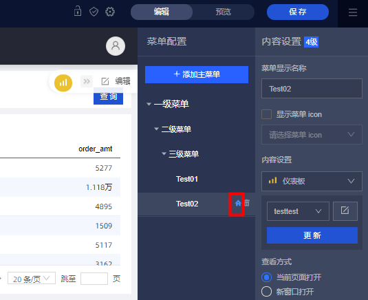 - 单击保存,重新打开即可看到三级菜单首次显示的是Test02仪表板页面。