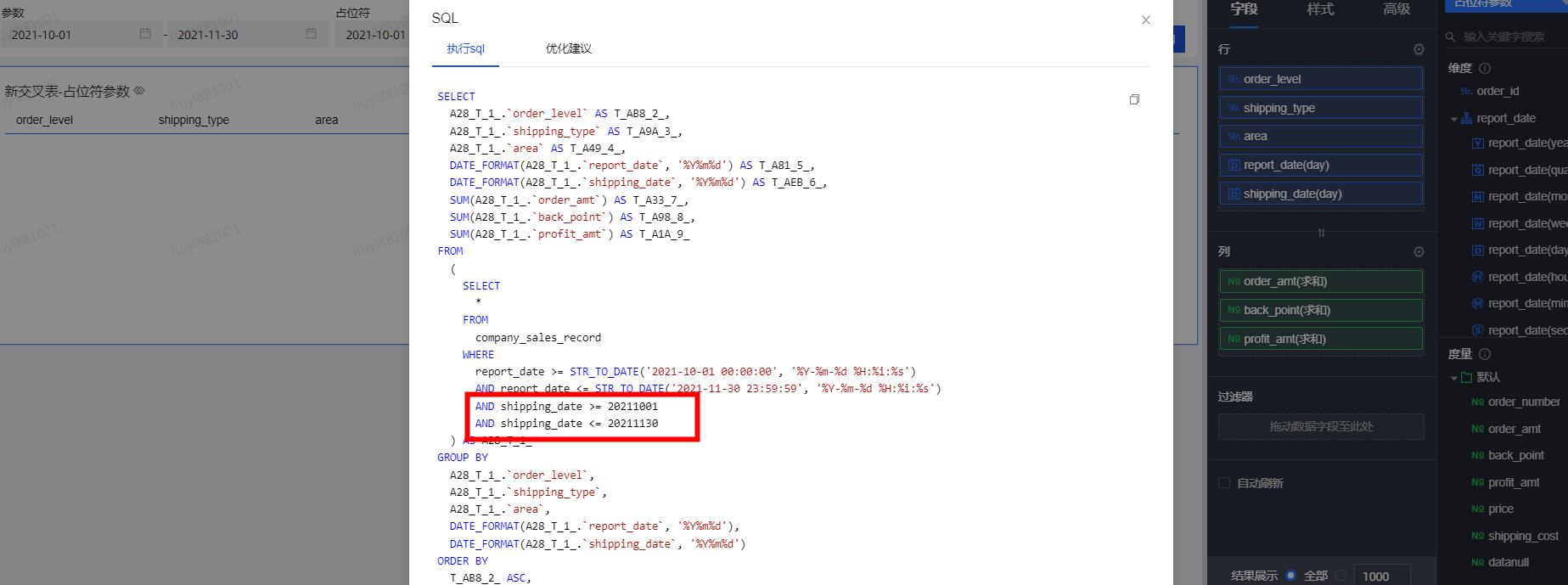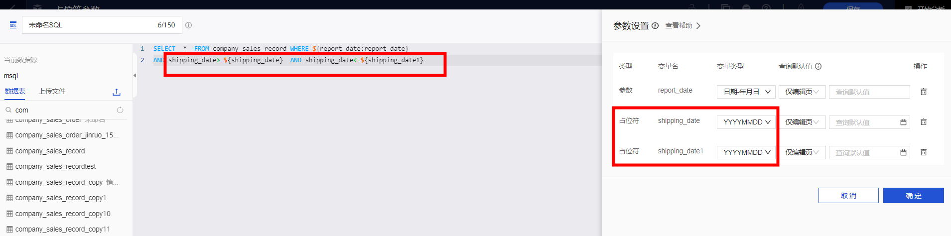 Quick BI中查询控件如何在选择年月日的情况下,自动带上00:00:00到23:59:59秒的精确时间。客户SQL语句的占位符的类型选择"YYMMDD",查询控件无法传递时分秒。生成数据集的SQL语句和变量类型如下: