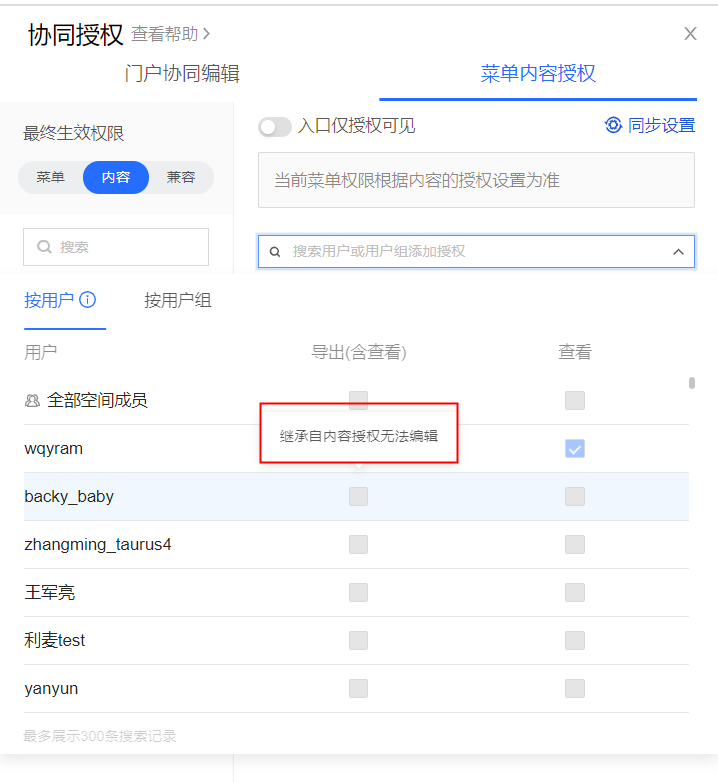 在数据门户的协同授权中菜单内容授权修改权限时,显示“继承自内容授权无法编辑”,即无法修改授权。