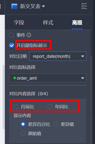 在新交叉表的高级标签中,勾选“开启副指标展示”,为什么对比日期选为月后,对比内容选择中没有月同比的选项?原因如下: