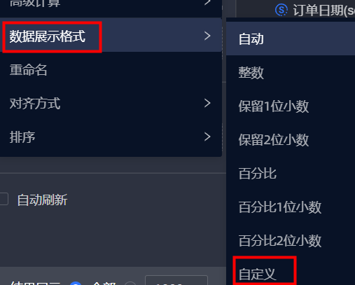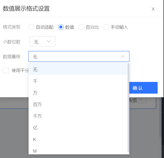 选择某个字段的下拉三角,选择【数据展示格式】,【自定义】,在自定义的【数值】,【数据量级】中可以自定义选择单位。