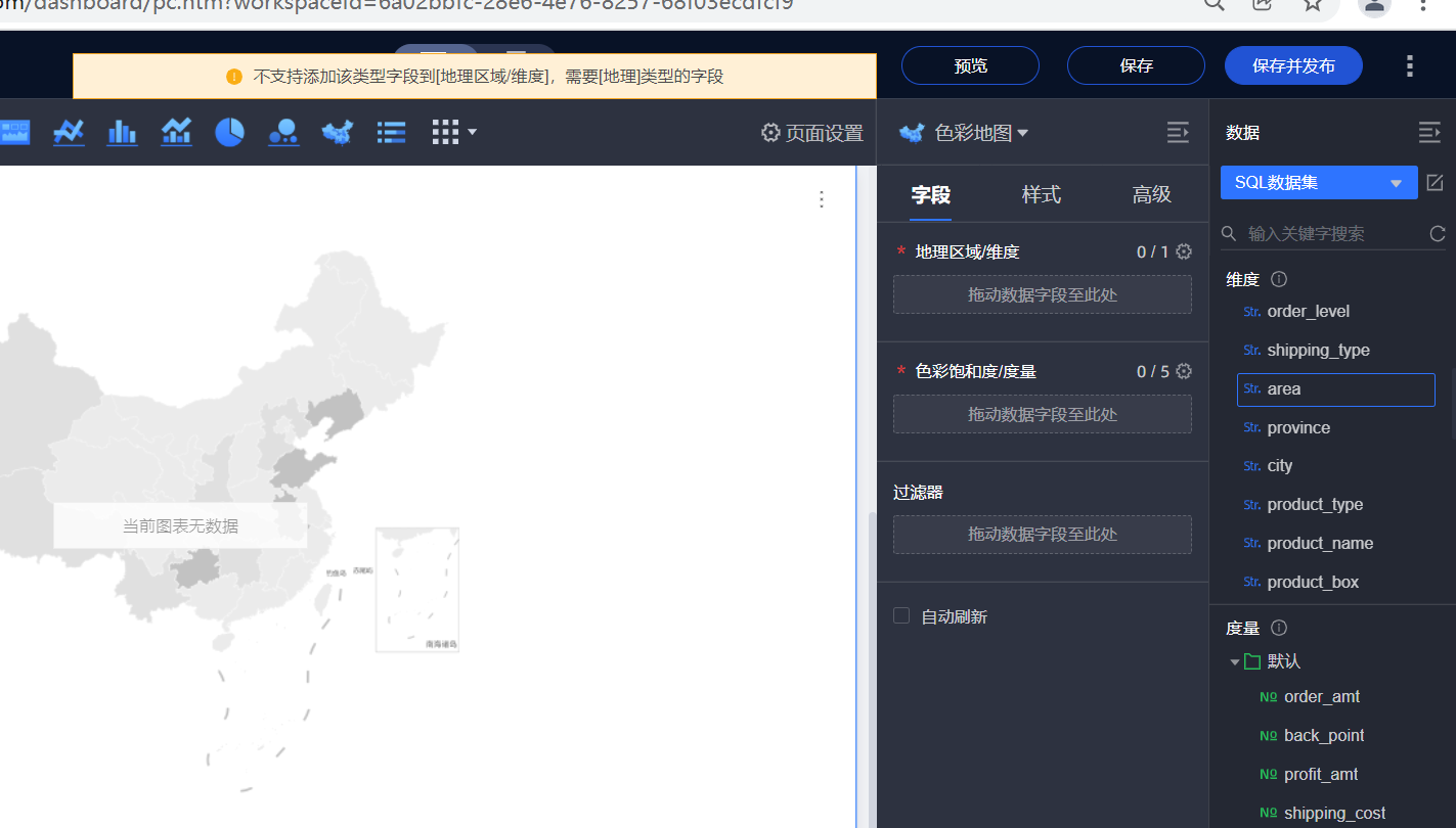 用户在使用色彩地图的时候,发现没办法添加维度,提示“不支持添加该类型字段到[地理区域/维度],需要[地理]类型的字段”。
