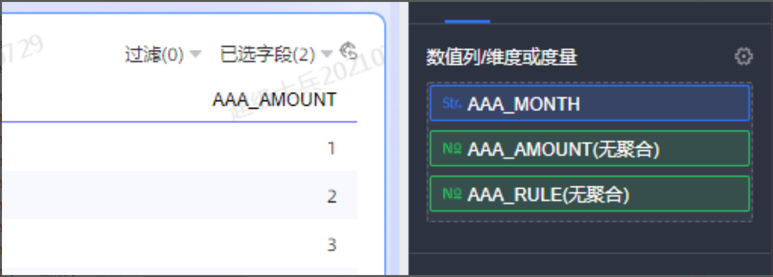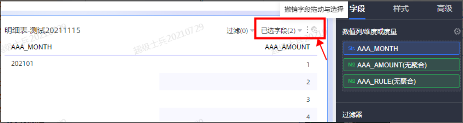 1 点击图表右上角的撤销字段拖动与选择,会和数据设置的情况一致,隐藏的字段全部恢复。