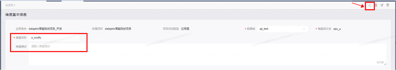 在维度编辑页面,单击右上角的“锁”按钮,当前用户抢锁锁定编辑页面后,即可对维度的中文名称修改。