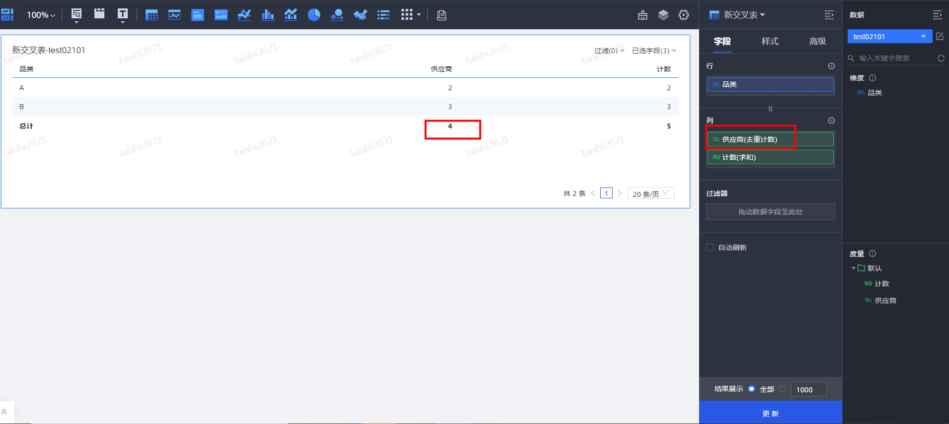 将“供应商”字段转换为度量字段,然后对此字段直接设置去重计数。