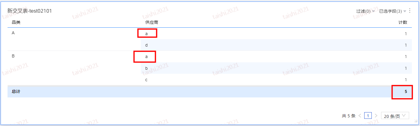 Quick BI如何对仪表板的分组数据进行全局的去重计数?如下所示的“供应商”在品类A和B中a是重复的,导致总计值没有去重。