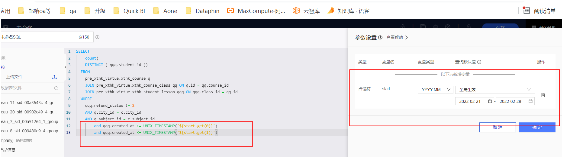 1.SQL生成数据集时,可以对变量数据进行类型转换,使用UNIX_TIMESTAMP函数将前端变量传递进来的值转换为timestamp类型,具体使用占位符即可。
