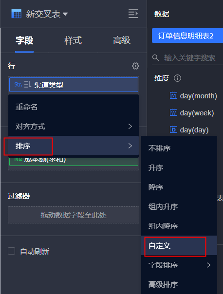在仪表板字段配置中,对字段排序选择自定义排序,即可调整字段值展示顺序。