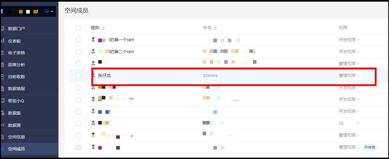 该成员是空间管理员,空间管理员和Owner默认有权限,所以不展示在列表。