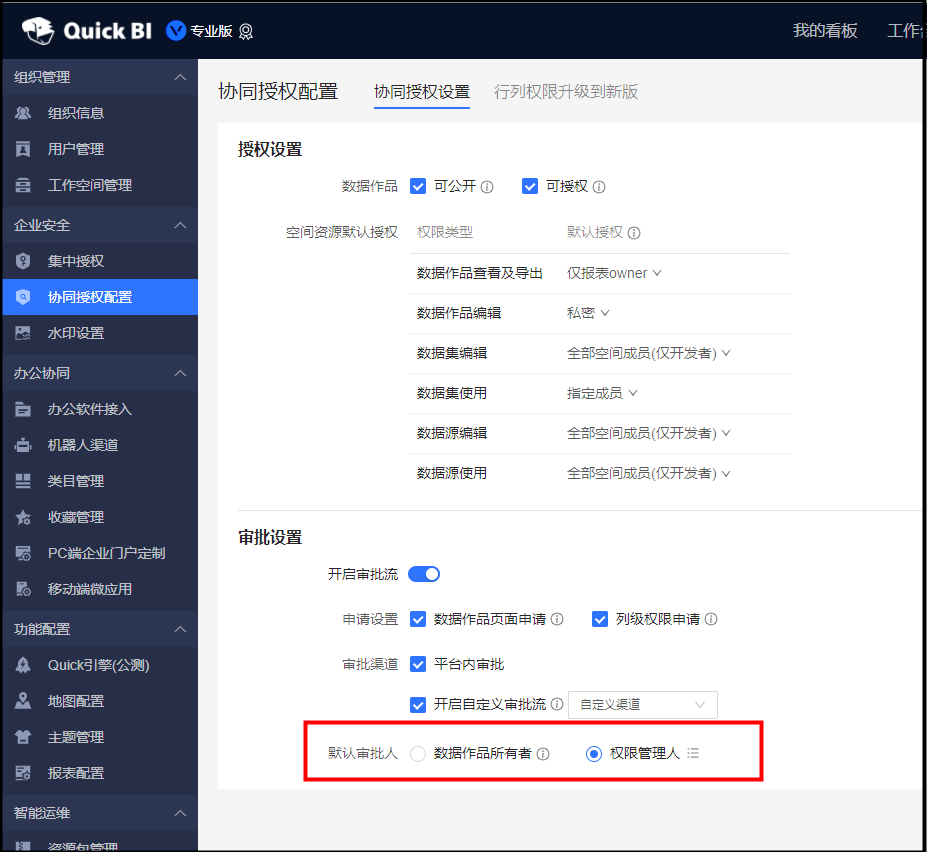 在配置面板中的协同授权配置中默认审批人选择的是权限管理人。