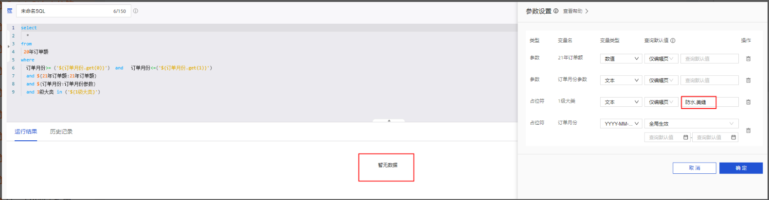 Quick BI在占位符设置多个默认值后无法过滤出数据,实际是有数据的。情况如下: