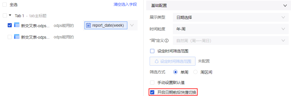 在查询控件的配置页面,勾选“开启日期前后快捷切换”即可。