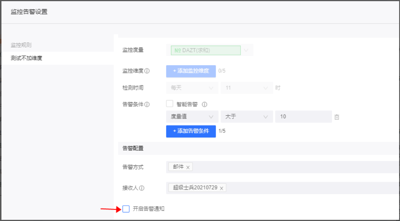 打开告警配置在右侧最下面开启告警通知勾选前面的选择框后在点击保存即可。