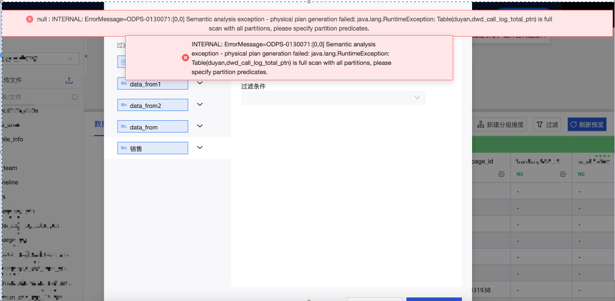 Quick BI数据集报错“xxx is full scan with all partitions, please specify partition predicates”,报错截图如下: