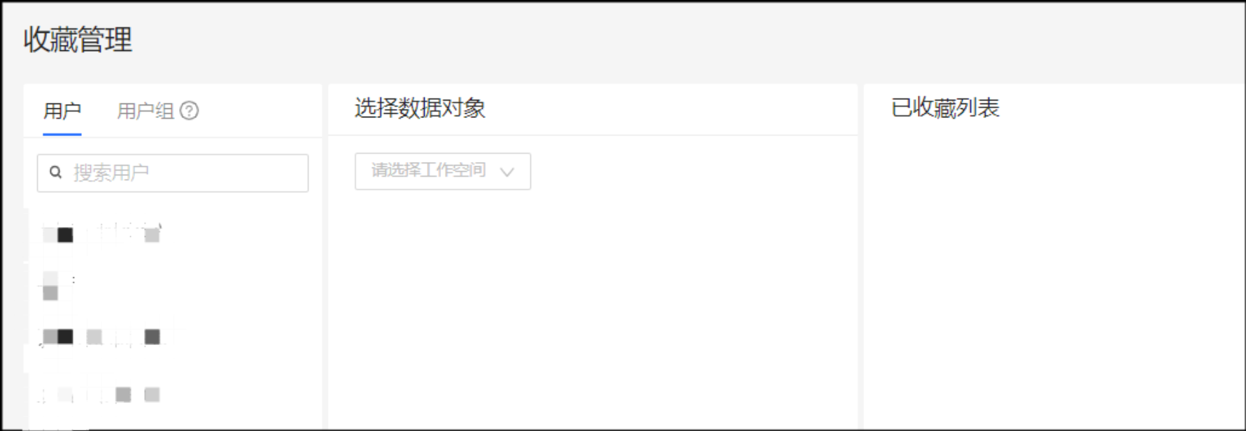 - 首先需要进入Quick BI配置面板页面,左侧栏点击查看‘收藏管理’功能。