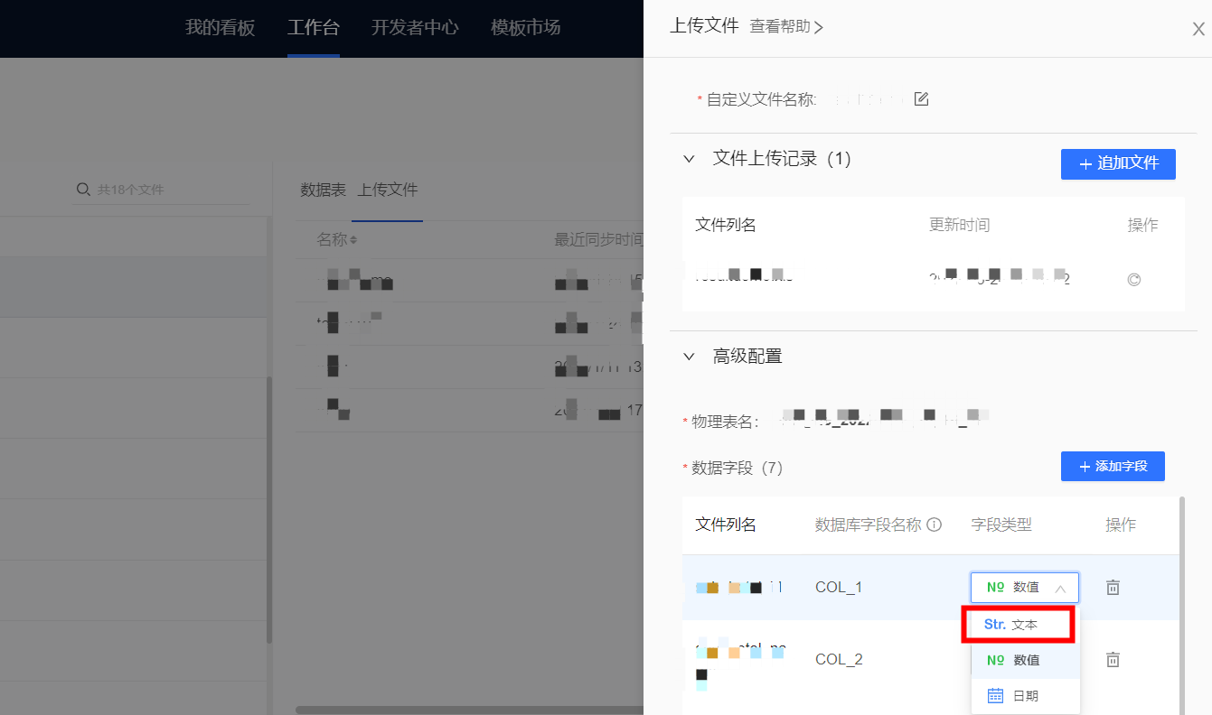 如果需要上传的文件某字段在数据表中为文本类型,可以直接在上传文件的高级设置指定字段类型为文本即可,或者在Excel中该字段下前100行内添加一个字符串即可。