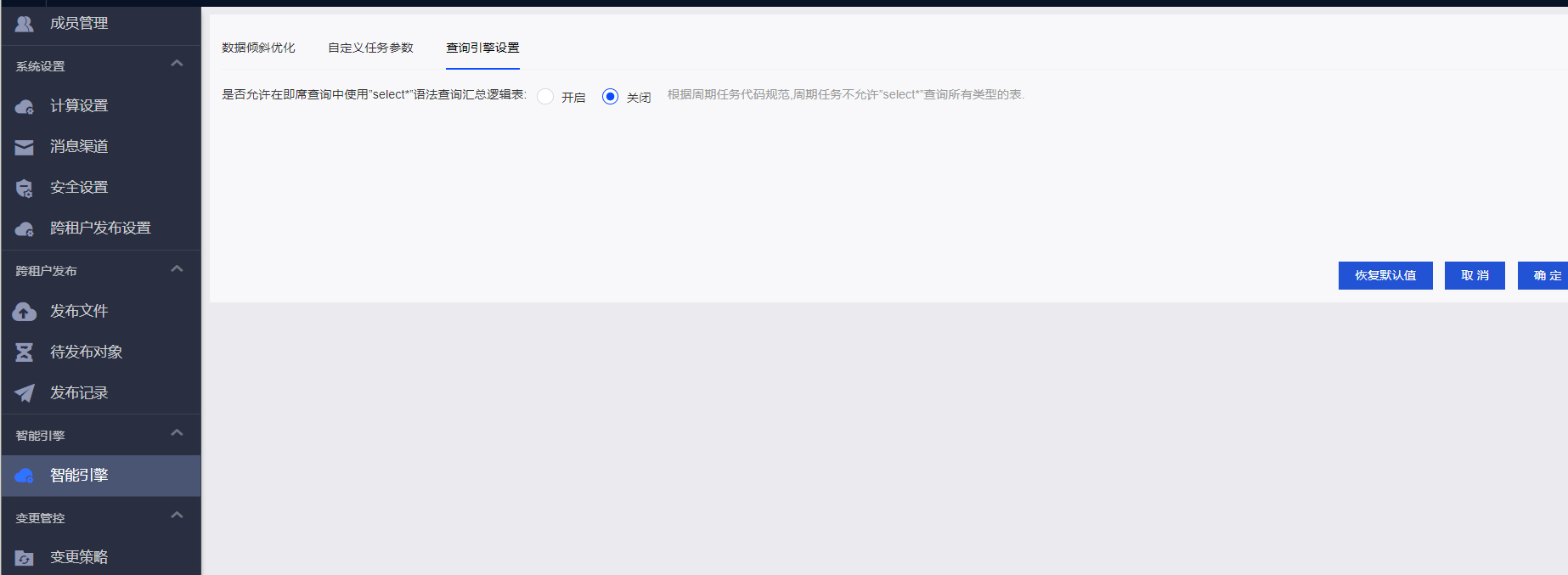 “管理中心” - “智能引擎”-“查询引擎设置”模块有个禁止即席查询中使用select *语法查询汇总逻辑表的开关,客户将开关打开导致。