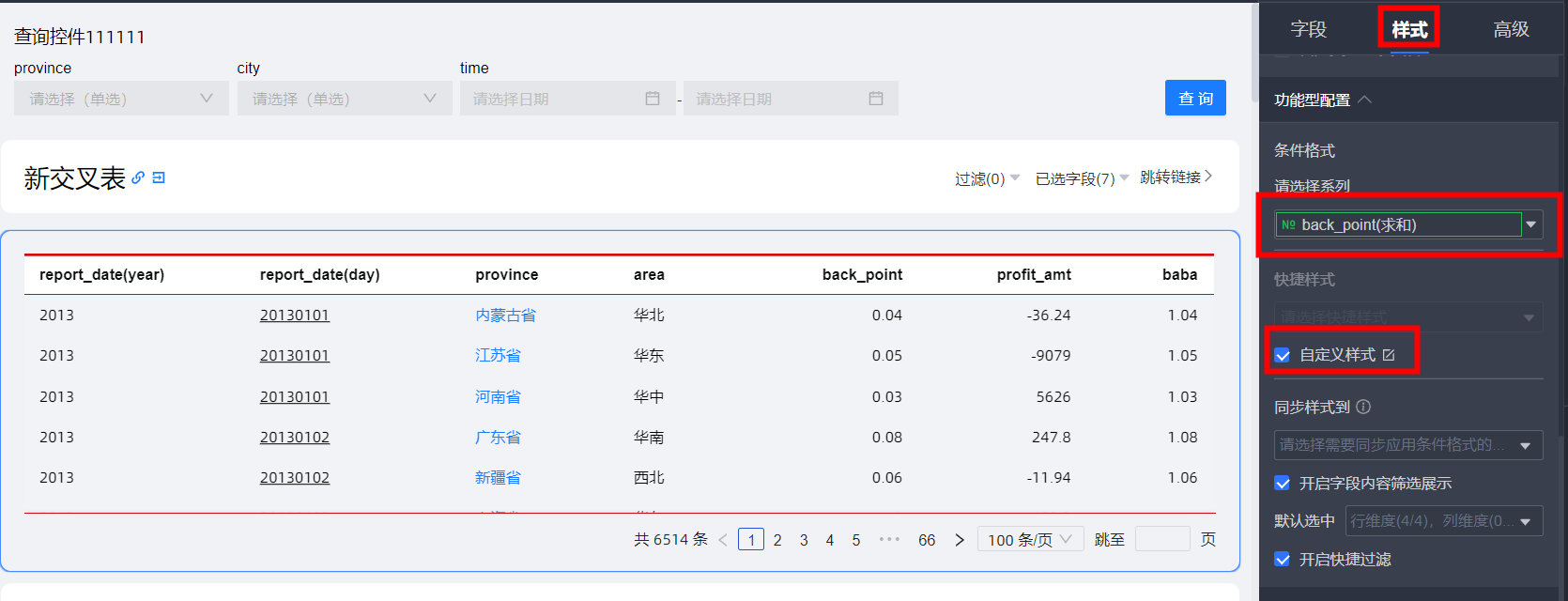 点击交叉表,在样式-功能型配置中选则需要修改的度量,并勾选自定义样式。