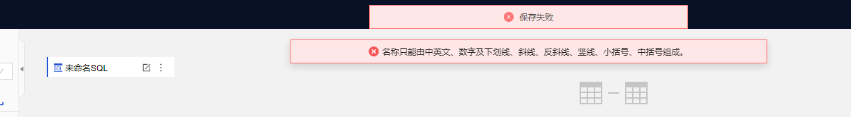 Quick BI通过SQL创建数据集保存报错:"名称只能由中英文、数字及下划线、斜线、反斜线、竖线、小括号、中括号组成"。