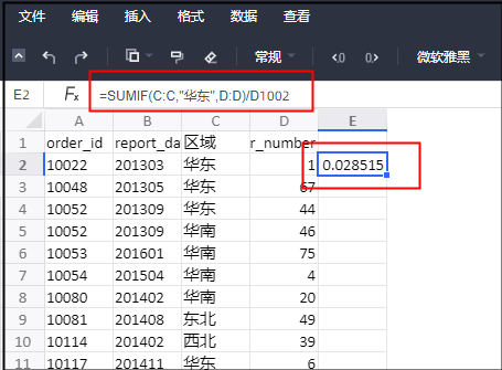 Fx=SUMIF(C:C,"华东",D:D)/D1002