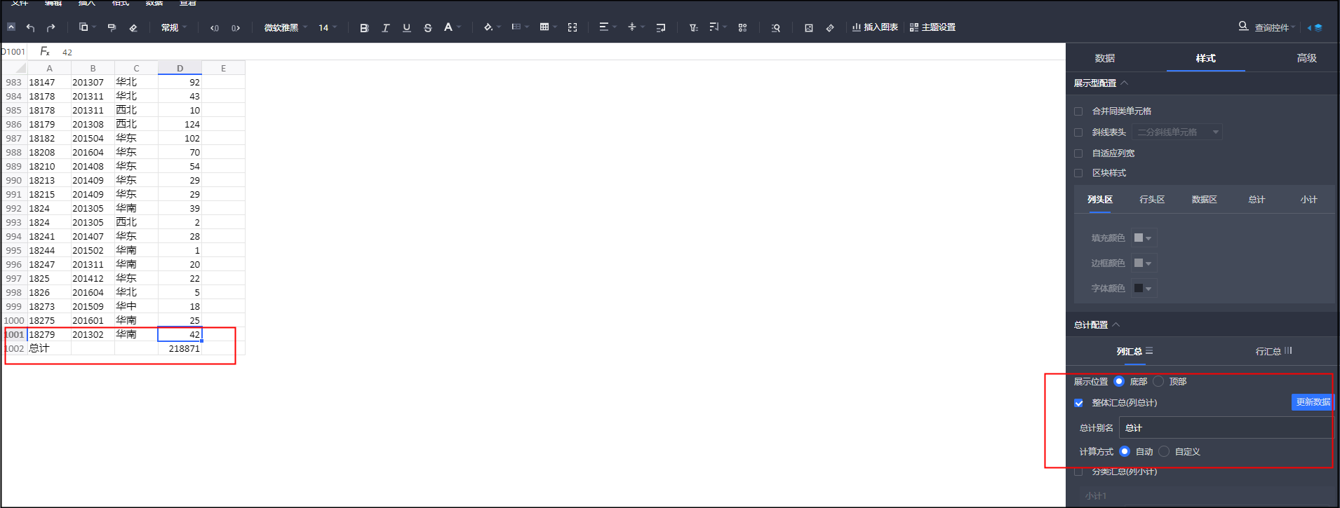 这里以区域维度为例 ,计算了order_number度量字段的占比。我们需要先在样式中点列汇总计算出度量值的总和。