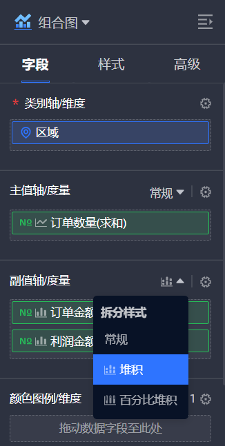 组合图的“副值轴”中,拆分样式选择“堆积”。