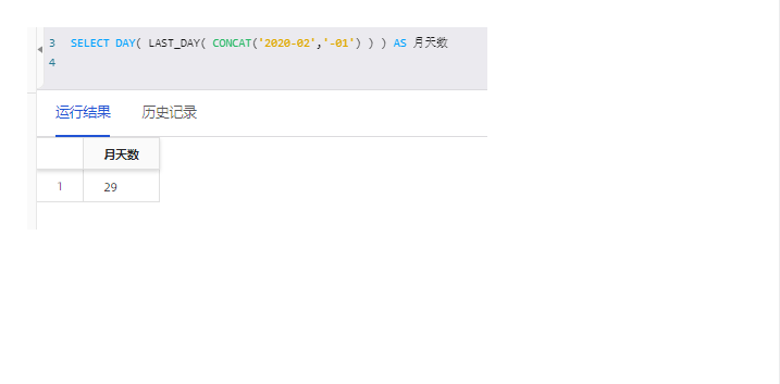 根据数据集连接使用的数据库不同,可以使用对应数据库的日期函数处理计算,例如MySQL数据库的话,可以做如下处理计算获取到2020年2月份的天数值:
