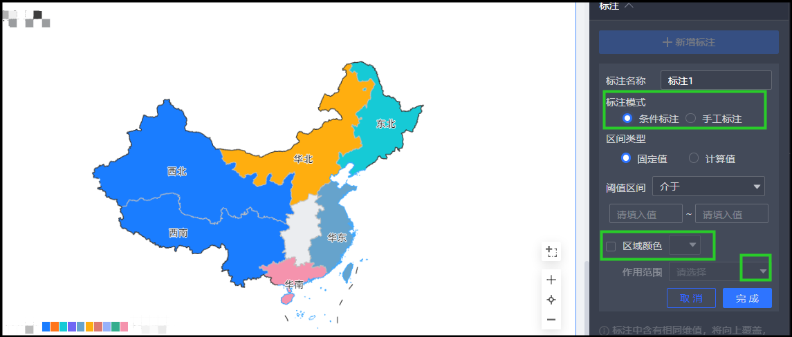 - 也可以根据色彩地图添加的度量值设置各个区块的颜色,在高级设置中点击标注,按需要设置条件标注,或者可以直接手工标注,选择需要标注的维度值,设置颜色即可。如下图所示: