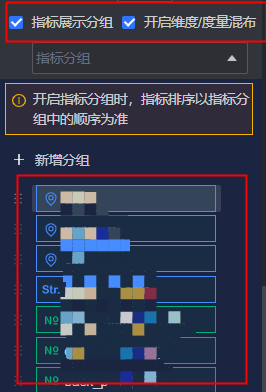 如果需要展示维度字段,可以维度字段和度量字段都添加,开启维度/度量混布后,则可以展示添加的维度、度量字段。按需要进行设置分组展示即可。