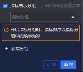 Quick BI新交叉表开启指标展示分组后,点击指标分组页面为什么不显示已添加的字段