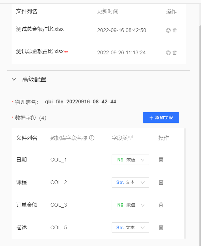 Quick BI的数据源数据表添加新字段,但是数据集无法显示更新。数据表是上传文件生成的数据表,在数据库中更新字段后,数据集预览无法更新过来。上传文件生成的数据表,更新添加字段时需要在上传文件时添加字段。