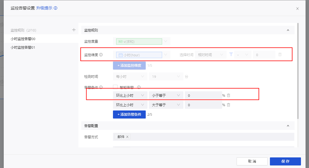 Quick BI监控告警配置环比上小时出现小时环比值是0。