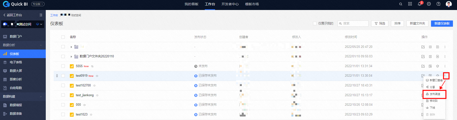 Quick BI仪表板功能列表中没有“发布渠道”功能入口
