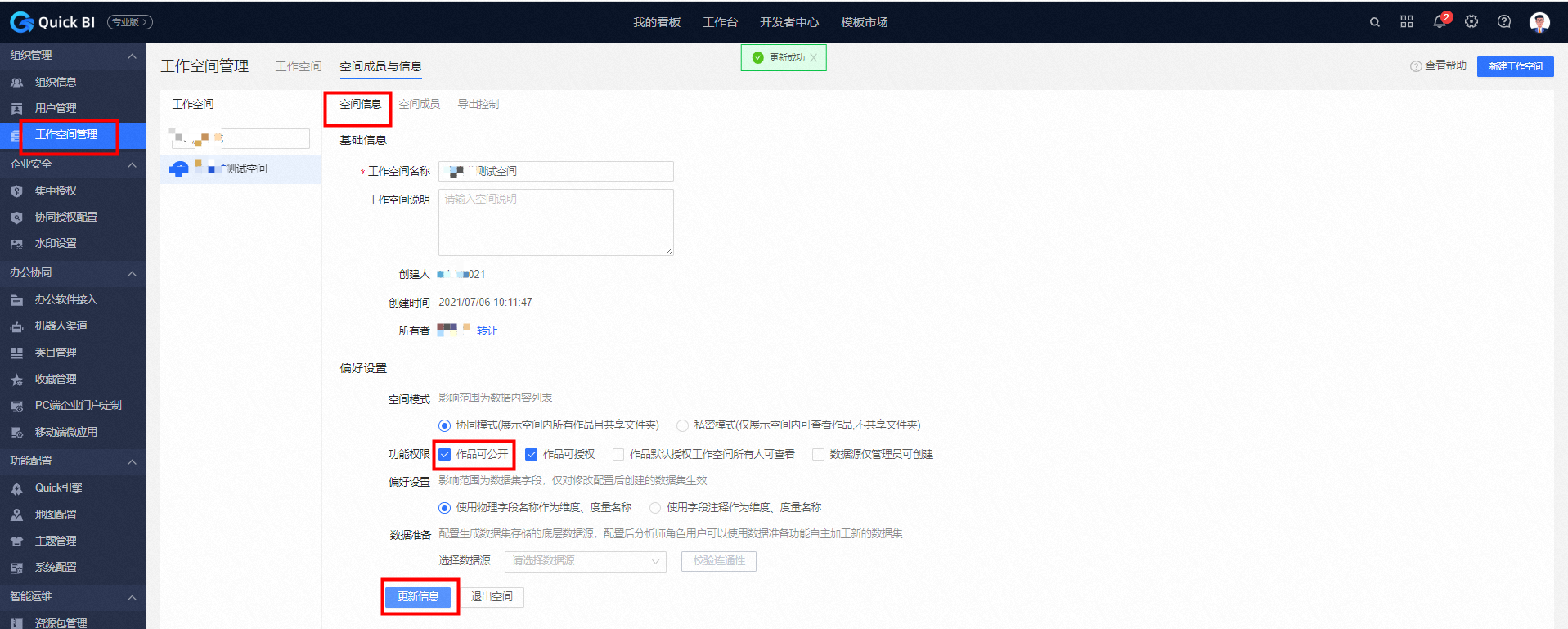 在工作空间管理中,空间信息设置中勾选功能权限的“作品可公开”,然后点击‘更新信息’按钮即可。