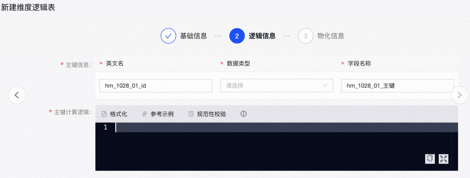 当物理表中主键的形式为联合主键时,可以在写维度逻辑表的主键定义逻辑时,通过计算源支持的一些函数,比如concat()函数,将两个字段合并为一个主键字段,实现逻辑表主键的定义。