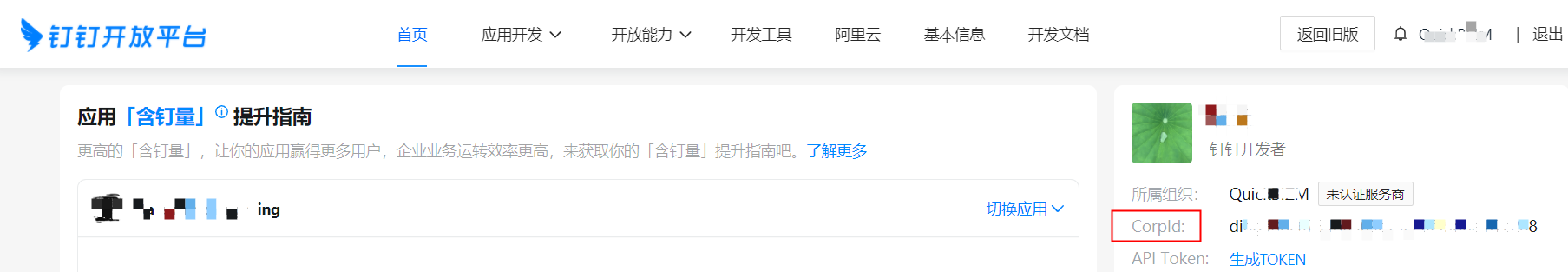 钉钉管理员登录钉钉开发者平台并获取CorpId参数。