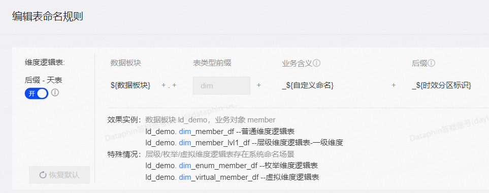 开启后,新建维度逻辑表的天表,名称会额外增加后缀 df(形式如"DIM_对象名_df")。如不开启,无 df 后缀。特别地,设置后,对新生成的表生效,已生成表无法更名。