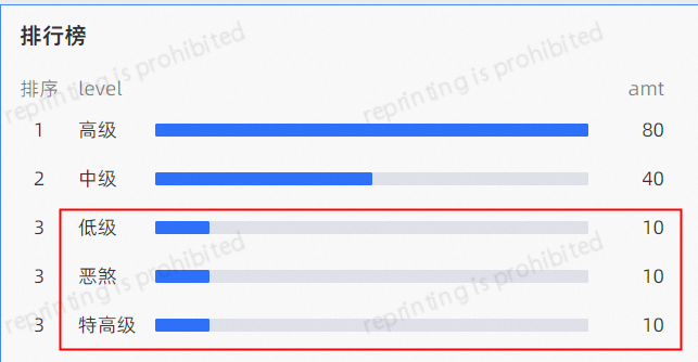 排行榜图表组件当聚合值相同时,维度值的排序是跟随数据所对应数据源的种类决定的;MySQL数据源会遵循MySQL数据源的排序规则,Oracle数据源会遵循Oracle数据源的排序规则。