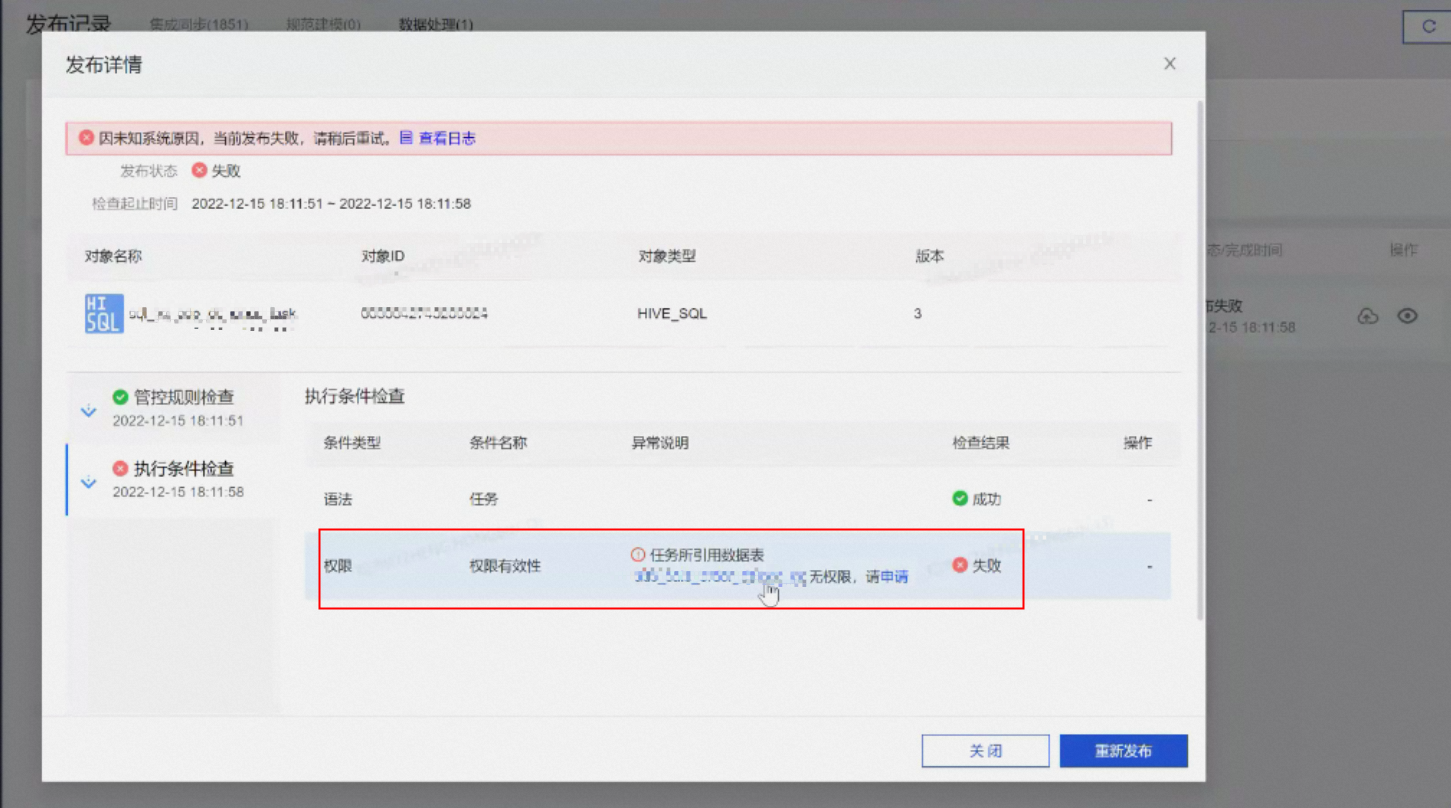 Dataphin脚本任务发布失败,提示需要申请表权限;已经申请权限还是报同样的错误?