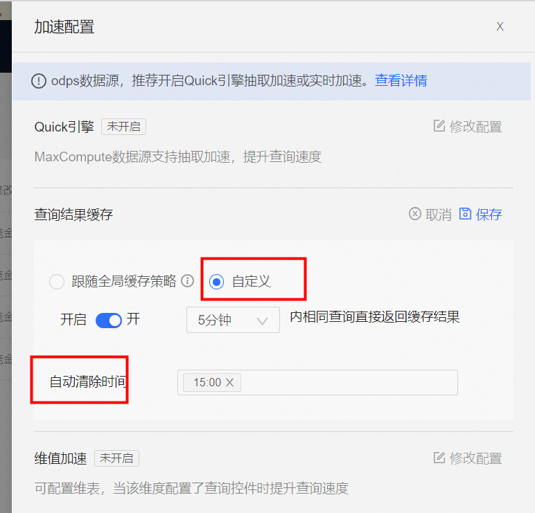 查询结果方式采用自定义缓存方式,设置一个更短时间内的缓存时间,以及设置缓存的自动清除时间,即可保证数据集和图表数据能够及时得到更新。