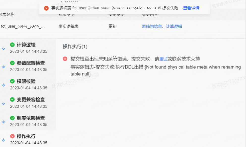 用户手工drop了事实逻辑表对应的物化表,导致提交报错。